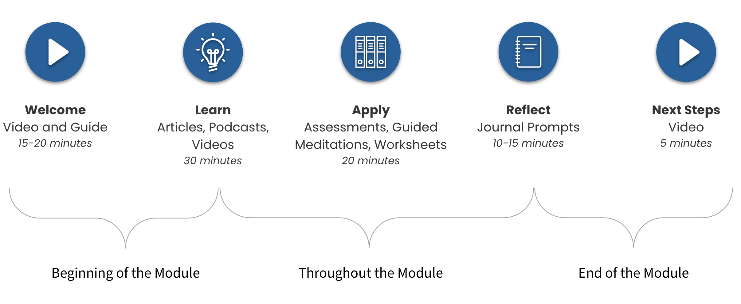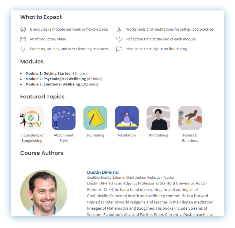 The Flourishing Course delivers six engaging modules with interactive assessments, tools, and tips. It builds skills in four essential domains: